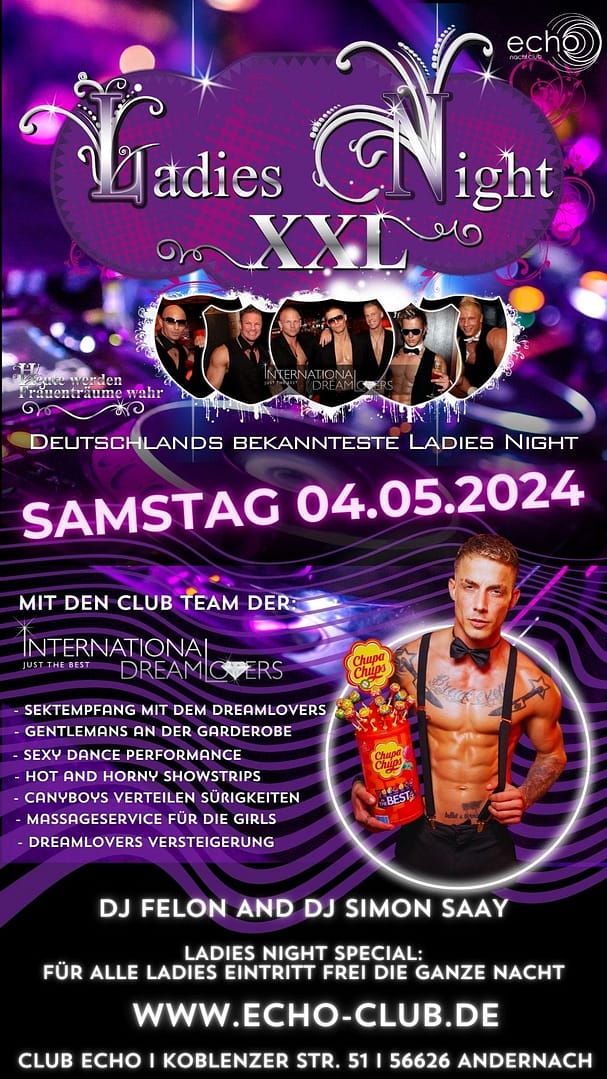 Am 4.5.24 treten unsere Boys in Andernach auf und begrüßen die Ladies im Club Echo mit einem sexy Empfang und als Gentlemen an der Garderobe, weiter geht es an dem Abend mit einer sexy Dance Performance und Stripperinnen und Stripper Shows, sowie Massagen für die Damen. Am Ende des Abends können sich die Damen einen unserer Dream-Boys für ein Getränk an der Theke zu zweit ersteigern.